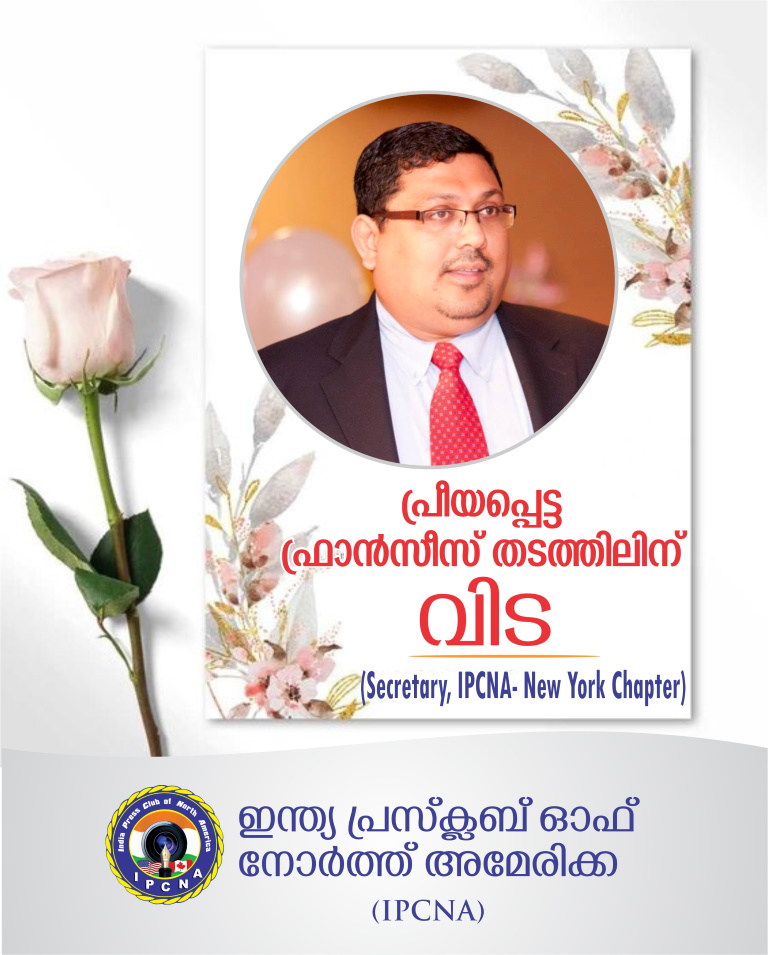അകാലത്തിൽ വേർപിരിഞ്ഞ പ്രിയ സഹപ്രവർത്തകൻ ഫ്രാൻസിസ് തടത്തിലിന് ബാഷ്പാഞ്ജലിയുമായി ഇന്ത്യാ പ്രസ് ക്ലബ് ഓഫ് നോർത്ത് അമേരിക്ക. കേരളത്തിൽ വിവിധ പ്രസ് ക്ലബുകളിലും ഇവിടെ വന്ന ശേഷം ഇന്ത്യ പ്രസ് ക്ലബിലും ദീർഘകാലമായി അംഗമായ ഫ്രാൻസിസിന്റെ വേർപാട് നികത്താനാവാത്തതാണെന്നു പ്രസ് ക്ലബ് ഭാരവാഹികളും അംഗങ്ങളും ചൂണ്ടിക്കാട്ടി. അകാലത്തിലുള്ള ഈ വിടപറയൽ പ്രഗത്ഭനായ ഒരു പത്രപ്രവർത്തകനെയാണ് അമേരിക്കൻ മലയാളികൾക്ക് നഷ്ടമാക്കിയത്. മാധ്യമ രംഗത്തു അദ്ദേഹം കൈവയ്ക്കാത്ത മേഖലകളില്ല. അവിടെയെല്ലാം മുന്നണിയിൽ എത്താൻ കഴിഞ്ഞ അപൂർവം ചില പത്രപ്രവർത്തകരിലൊരാളാണ് ഫ്രാൻസിസ് തടത്തിൽ.