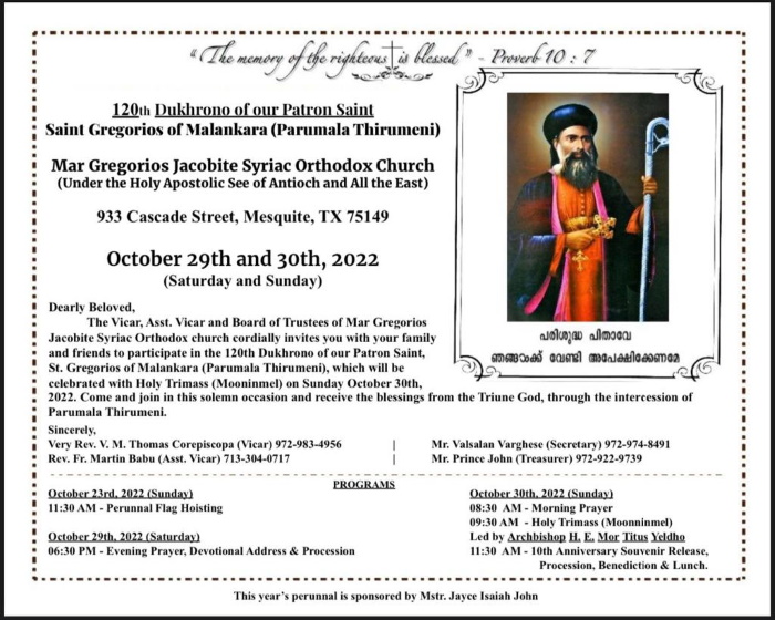 ടെക്സസ്: പരിശുദ്ധ പരുമല തിരുമേനിയുടെ നാമത്തില് സ്ഥാപിതമായിട്ടുള്ള മെസ്കീറ്റ് മാര് ഗ്രിഗോറിയോസ് പള്ളിയിലെ പെരുന്നാളും 10-ാം വാര്ഷികവും ഒക്ടോബര് 29, 30 (ശനി, ഞായര്) ദിവസങ്ങളില് ഭംഗിയായി ആഘോഷിക്കുവാന് കര്തൃനാമത്തില് താല്പര്യപ്പെടുന്നു.