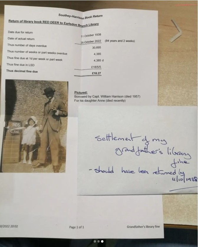 84 വർഷം മുമ്പ് മുത്തച്ഛന് ലൈബ്രറിയില് നിന്നെടുത്ത പുസ്തകം ചെറുമകന് തിരിച്ചേല്പിച്ചു. 1957-ല് അന്തരിച്ച ക്യാപ്റ്റന് വില്ല്യം ഹാരിസന്റെ ചെറുമകൻ പാഡി റിയോര്ഡനാണ് പുസ്തകം തിരികെ നല്കാന് 2022 ഒക്ടോബര് 25-ന് ലൈബ്രറിയില് എത്തിയതെന്ന് ഒരു ബ്രിട്ടീഷ് ലൈബ്രറി അധികൃതര് പറഞ്ഞു. അദ്ദേഹം 18.27 പൗണ്ട് ($21.14 യു എസ് ഡോളര്) ലേറ്റ് ഫീയും അടച്ചെന്ന് അവര് പറഞ്ഞു.