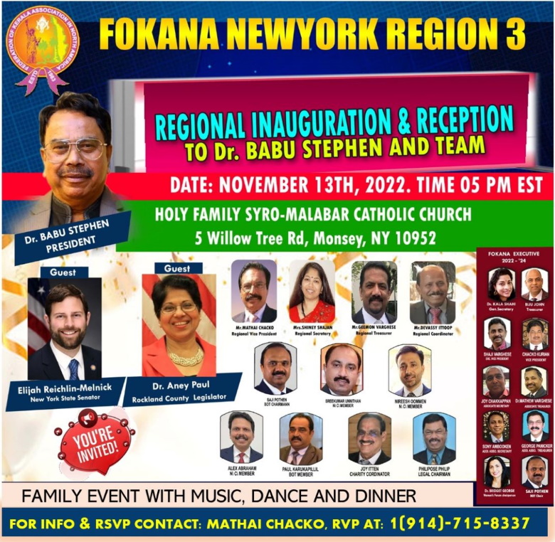 ന്യൂയോർക്ക്: ഫൊക്കാന ന്യൂയോര്ക്ക് റീജിയന്റെ (3) പ്രവർത്തനോദ്ഘാടനം നവംബർ 13 ഞായറാഴ്ച 5 മണിക്ക് റോക്ലാൻഡ് ഹോളി ഫാമിലി സിറോ മലബാർ ചർച്ച് ഓഡിറ്റോറിയത്തിൽ വെച്ച് (5 Willow Tree Road , Monsey, NY 10952 ) ഫൊക്കാന പ്രസിഡന്റ് ഡോ. ബാബു സ്റ്റീഫൻ നിർവഹിക്കുന്നതായിരിക്കുമെന്ന് ഫൊക്കാന റീജണൽ വൈസ് പ്രസിഡന്റ് മത്തായി ചാക്കോ അറിയിച്ചു.