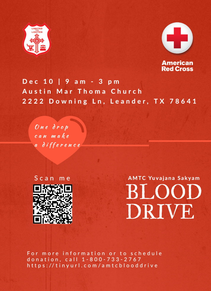 അമേരിക്കൻ റെഡ്ക്രോസ്സിന്റെ സഹകരണത്തോടെ നടത്തുന്ന ബ്ളഡ് ഡ്രൈവ് ഓസ്റ്റിൻ മാർത്തോമാ ദേവാലയത്തോടെ ചേർന്നുള്ള ഫെല്ലോഷിപ് ഹാളിൽ (2222, Downing Ln, Leander, TX 78461) ഡിസംബർ 10 നു ശനിയാഴ്ച രാവിലെ 9 മുതൽ ഉച്ചകഴിഞ്ഞു 3 വരെയാണ് സംഘടിപ്പിച്ചിരിക്കുന്നത്.