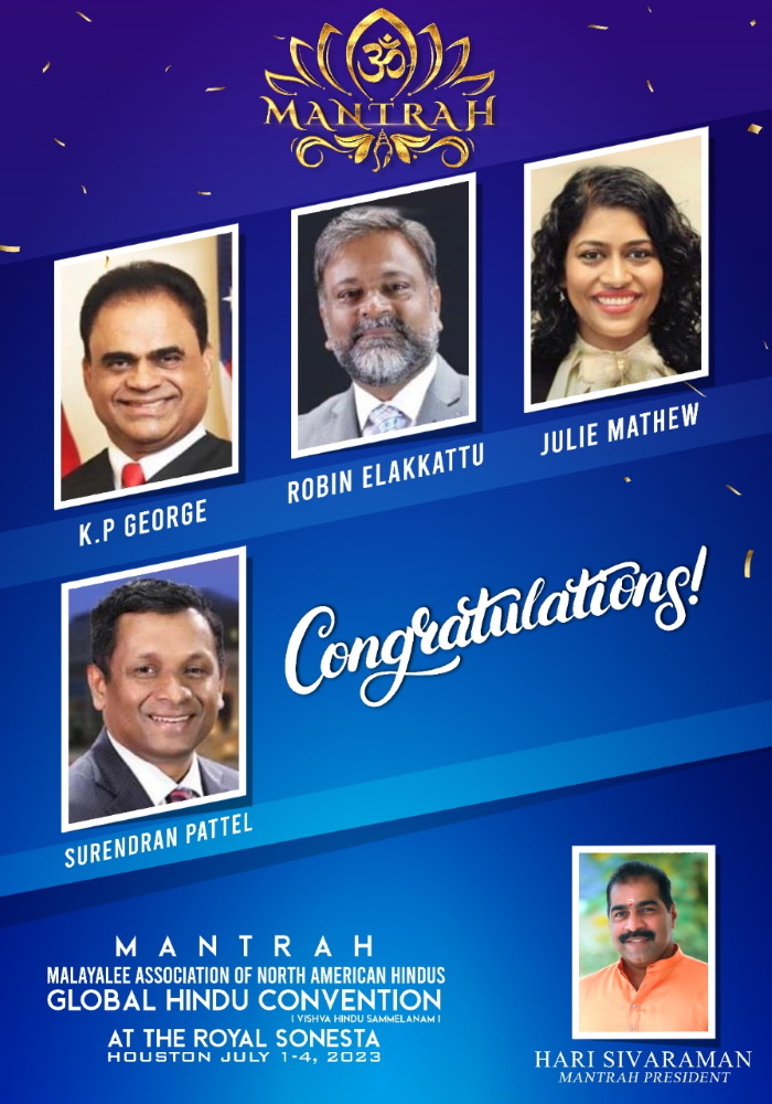 യു എസ് ഇടക്കാല തിരഞ്ഞെടുപ്പിൽ നടന്ന വാശിയേറിയ തിരഞ്ഞെടുപ്പിൽ വിജയിച്ച മലയാളികൾക്ക് അഭിനന്ദനത്തിന്റെ പൂച്ചെണ്ടുമായി മലയാളി അസോസിയേഷൻ ഓഫ് നോർത്ത് അമേരിക്കൻ ഹിന്ദുസ് (മന്ത്ര). അമേരിക്കയിലെ മുഖ്യ ധാര രാഷ്ട്രീയത്തിൽ ഇന്ത്യൻ സാന്നിധ്യം പ്രകടമാണെങ്കിലും മലയാളികൾ കൂടുതൽ ആയി മുന്നോട്ടു വരുന്നതും വിജയിക്കുന്നതും അവരുടെ മാതൃകാപരമായ പ്രവർത്തനങ്ങളുടെ ഫലം ആണെന്ന് കരുതുന്നതായി മന്ത്ര പ്രസിഡന്റ് ഹരി ശിവരാമൻ അഭിപ്രായപ്പെട്ടു. അമേരിക്കയിലെ ഇന്ത്യൻ സമൂഹത്തിനു കൂടുതൽ ആത്മവിശ്വാസവും രാഷ്ട്ര നിർമാണത്തിൽ പങ്കു ചേരുന്നതിനു കൂടുതൽ ആളുകൾക്ക് മുന്നോട്ടു വരാൻ പ്രചോദനം ആകുന്ന വിജയം ആയി ഇതിനെ കണക്കാക്കുന്നു എന്നും അദ്ദേഹം പറഞ്ഞു.