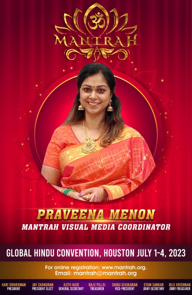 തൃശൂർ സ്വദേശിനിയായ ശ്രീമതി പ്രവീണ മേനോൻ കുടുംബത്തോടൊപ്പം രണ്ട് പതിറ്റാണ്ടിലേറെയായി ന്യൂജേഴ്സിയിലാണ് താമസിക്കുന്നത്. 17-ാം വയസ്സിൽ വിഷ്വൽ മീഡിയയിൽ എംസി, നർത്തകി, നൃത്തസംവിധായകൻ, സൗന്ദര്യമത്സര ജേതാവ്, മോഡൽ എന്നീ നിലകളിൽ അവർ കേരളത്തിൽ ജീവിക്കുമ്പോൾ തന്നെ തന്റെ കരിയർ ആരംഭിച്ചു. അമേരിക്കയിലേക്ക് മാറിയതിന് ശേഷവും അവൾ വിഷ്വൽ മീഡിയയോടുള്ള അഭിനിവേശം തുടർന്നു.നിലവിൽ ഡെൽ ടെക്നോളജീസിലെ ഗ്ലോബൽ അലയൻസ് എക്സിക്യൂട്ടീവായി പ്രൊഫഷണലായി ജോലി ചെയ്യുന്ന അവർ, ന്യൂജേഴ്സി മേഖലയിലും പരിസരത്തുമുള്ള വിവിധ ഇന്ത്യൻ കമ്മ്യൂണിറ്റികളിലുടനീളമുള്ള ഇവന്റുകളുടെ അവതാരകയായും നൃത്തസംവിധായകയായും നർത്തകിയായും സമൂഹത്തിന്റെ വിവിധ തലങ്ങളിൽ പ്രവർത്തിക്കുന്നു . ഇന്ത്യയിലും യുണൈറ്റഡ് സ്റ്റേറ്റ്സിലും ഒന്നിലധികം തത്സമയ സ്റ്റേജ് ഷോകൾ, സോഷ്യൽ മീഡിയ ഇവന്റുകൾ, ടിവി ഷോകൾ എന്നിവ ആങ്കർ ചെയ്തിട്ടുണ്ട്, കൂടാതെ ട്രൈ-സ്റ്റേറ്റിലെ പ്രശസ്തമായ സാംസ്കാരിക ആർട്ട് ഗ്രൂപ്പായ മിത്രാസ് ആർട്ട്സിന്റെ ഡാൻസ് ഡയറക്ടർ പദവിയും അവർ നേടിയിട്ടുണ്ട്.