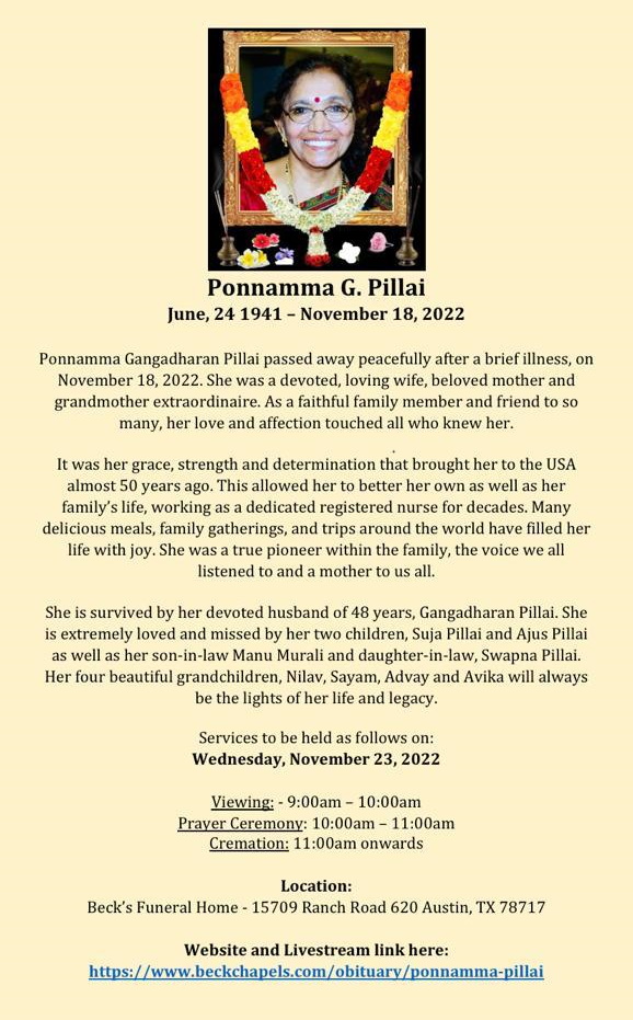 ഓസ്റ്റിന് (ടെക്സസ്): നവംബര് 18 വെള്ളിയാഴ്ച അന്തരിച്ച പൊന്നമ്മ പിള്ളയുടെ ശവ സംസ്ക്കാരം നവംബര് 23 ബുധനാഴ്ച ഓസ്റ്റിനിലെ ബെക്സ് ഫ്യൂണറല് ഹോമില് നടക്കുമെന്ന് കുടുംബാംഗങ്ങള് അറിയിച്ചു.