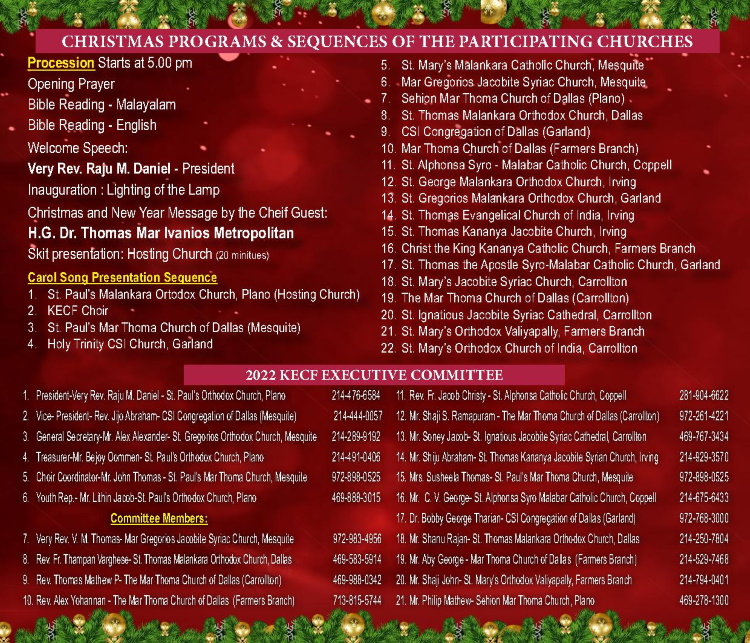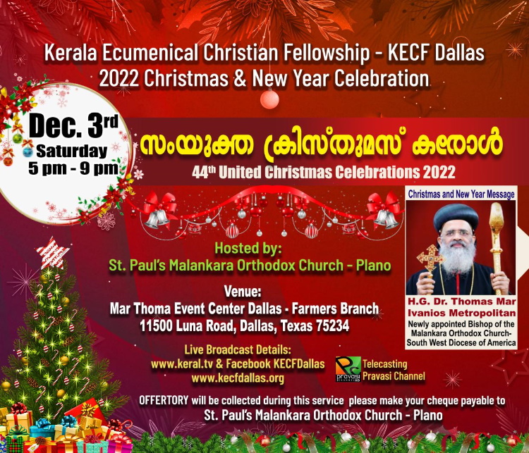 ഡാളസ്സ് ഫോർട്ട് വ്ർത്തിലെ 21 ക്രിസ്തീയ വിഭാഗങ്ങള് സംയുക്തമായി എല്ലാ വര്ഷവും ആഘോഷിക്കുന്ന ക്രിസ്മസ് ന്യൂ ഇയര് ആഘോഷങ്ങള്ക്ക് ഈ വര്ഷം ആതിഥേയത്വം വഹിക്കുന്നത് സെന്റ് പോൾ മലങ്കര ഓർത്തഡോൿസ് ചർച് (പ്ലാനോ)യാണ്