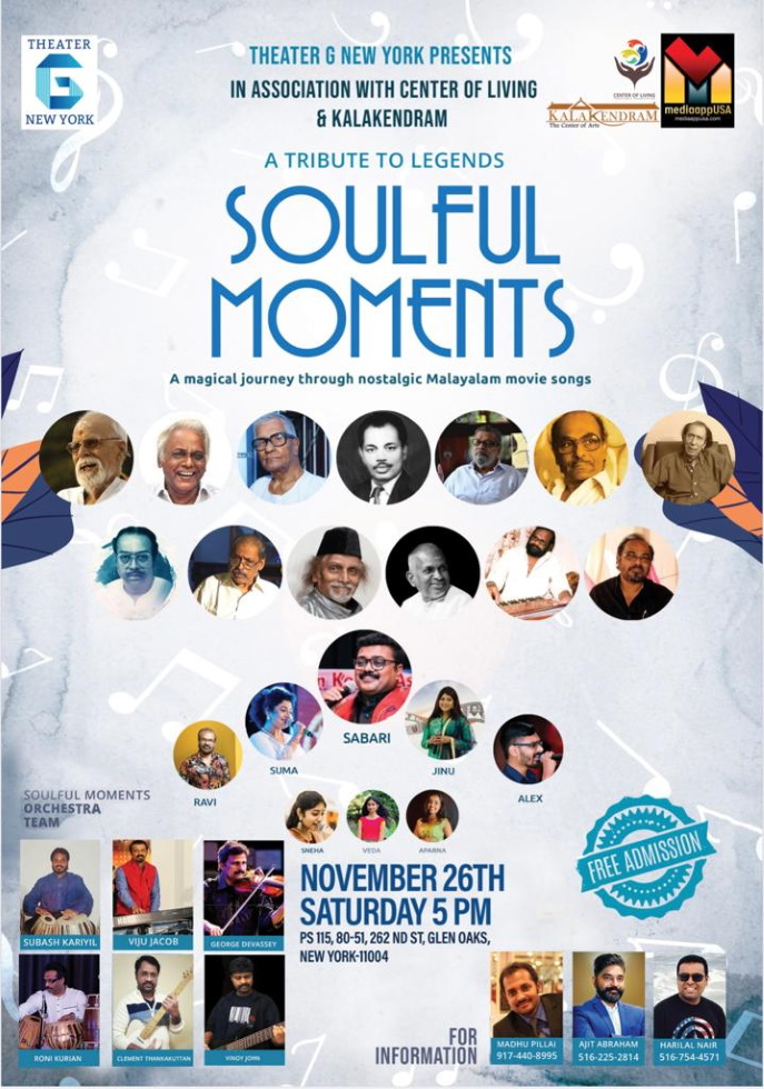 “Soulful Moments” (സർഗ്ഗാല്മക നിമിഷങ്ങൾ) എന്ന് നാമകരണം ചെയ്തിട്ടുള്ള ഈ പരിപാടിയിലൂടെ പ്രേക്ഷക മനസ്സിന് എന്നും കുളിർമ്മ നൽകുന്ന മനോഹര നൊസ്റ്റാൾജിക് മലയാളം സിനിമാ ഗാനങ്ങളിലൂടെയുള്ള മാസ്മരിക യാത്രയിലേക്ക് എല്ലാ മലയാളി സുഹൃത്തുക്കളെയും സാദരം ക്ഷണിക്കുന്നു. “Soulful Moments” ഓർക്കെസ്ട്രാ ടീമിനെക്കൂടി പരിചയപ്പെടുത്തട്ടെ. തബല – സുബാഷ് കാരിയിൽ, റോണി കുരിയൻ; കീ ബോർഡ് – വിജു ജേക്കബ്; വയലിൻ- ജോർജ് ദേവസ്സി; ഗിറ്റാർ – ഗിവേർട്ട് തങ്കകുട്ടൻ, വിനോയ് ജോൺ. ഗാന സന്ധ്യ ക്രമീകരിച്ചിരിക്കുന്ന സ്കൂൾ ആഡിറ്റോറിയം അഡ്രസ്സ് : PS 115, 80 – 51 262nd Street, Glen Oaks, New York – 11004 .