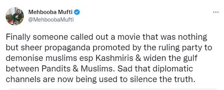 “ഒടുവിൽ ആരോ ഒരു സിനിമ നിര്മ്മിച്ചു, അത് മുസ്ലീങ്ങളെ പൈശാചികവൽക്കരിക്കാനും, പണ്ഡിറ്റുകളും മുസ്ലീങ്ങളും തമ്മിലുള്ള അകലം വർദ്ധിപ്പിക്കാനും ഭരണകക്ഷി പ്രചരിപ്പിക്കുന്ന കേവലമായ പ്രചരണമല്ലാതെ മറ്റൊന്നുമല്ല. സത്യത്തെ നിശ്ശബ്ദമാക്കാൻ നയതന്ത്ര ചാനലുകൾ ഇപ്പോൾ ഉപയോഗിക്കുന്നതിൽ ഖേദിക്കുന്നു,” മെഹബൂബ ട്വീറ്റ് ചെയ്തു.