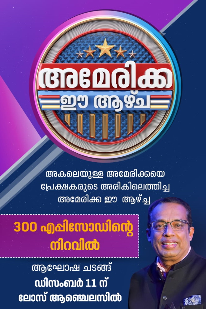 അമേരിക്കയിലെ എല്ലാ പ്രധാന വാർത്തകളും, വിശേഷങ്ങളും, വിശകലനങ്ങളും സമഗ്രമായി അവതരിപ്പിച്ച് പ്രേക്ഷകരുടെ ജനപ്രിയ പരിപാടിയായി മാറിയ അമേരിക്ക ഈ ആഴ്ച 300 എപ്പിസോഡ് എന്ന സുവർണ്ണ നാഴികക്കല്ല് പിന്നിടുകയാണ്.