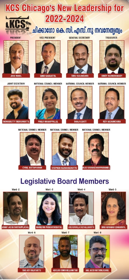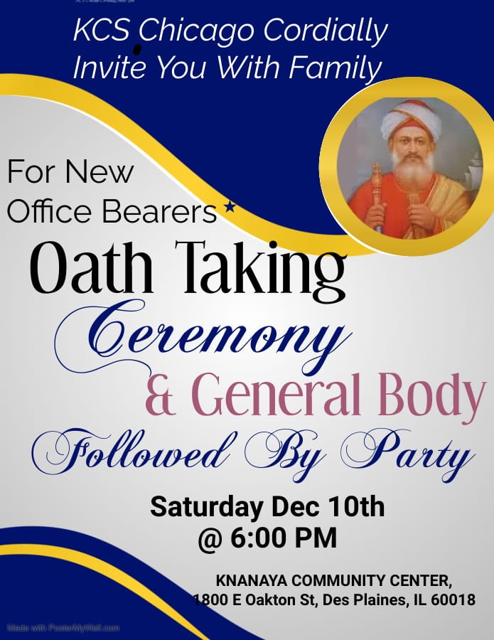 ഷിക്കാഗൊ: ഡിസംബർ 10 ശനിയാഴ്ച വൈകുന്നേരം 6:00 മുതൽ ഷിക്കാഗോ ക്നാനായ കമ്മ്യൂണിറ്റി സെന്ററിൽ ജെയിൻ മാക്കിലിന്റെ നേത്ര്യുത്വത്തിൽ പുതിയ കെ. സി. എസ്. ഭാരവാഹികളുടെ സത്യപ്രതിജ്ഞാ ചടങ്ങിൽ പങ്കെടുക്കാൻ പുതുതായി തിരഞ്ഞെടുക്കപ്പെട്ട കെ സിഎസ് എക്സിക്യൂട്ടീവും ഡയറക്ടർ ബോർഡും നിങ്ങളെ സ്നേഹപൂർവ്വം ക്ഷണിക്കുന്നു.