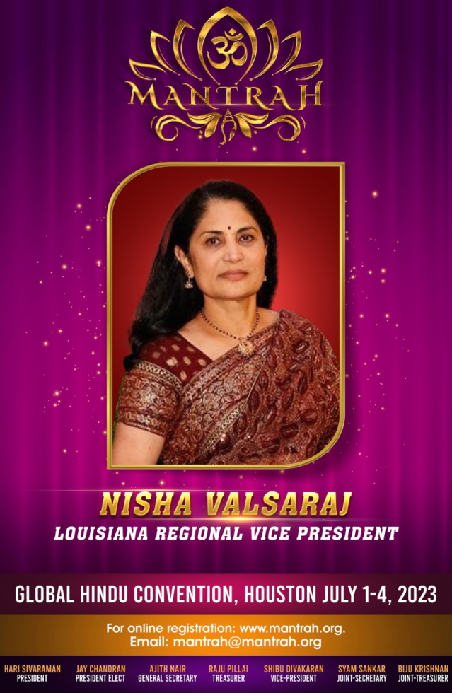 നിഷാ വത്സരാജിനെ മന്ത്ര ലൂയിസിയാന റീജിയണൽ വൈസ് പ്രസിഡന്റായി തിരഞ്ഞെടുത്തു. അവരുടെ സാമൂഹ്യ സംഘടനാപരമായ അറിവും അനുഭവപരിചയവും ലൂയിസിയാനയിൽ മന്ത്രയുടെ സംഘടനാ പ്രവർത്തനങ്ങൾ ശക്തിപ്പെടുത്താൻ ഏറെ സഹായകരമാകുമെന്ന് പ്രസിഡന്റ് ഹരി ശിവരാമൻ പ്രത്യാശ പ്രകടിപ്പിച്ചു.