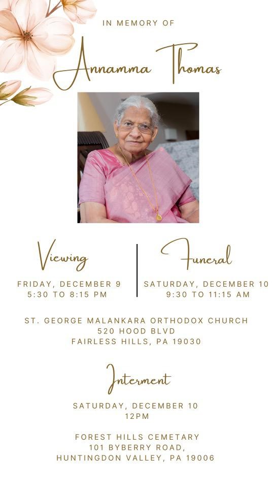 പൊതുദർശനം ഡിസംബർ 9 ന് വെള്ളിയാഴ്ച വൈകിട്ട് 5 :30 മുതൽ 8 :15 വരെയുള്ള സമയങ്ങളിലും, സംസ്ക്കാര ശുശ്രൂഷകൾ ഡിസംബർ 10 ന് ശനിയാഴ്ച രാവിലെ 9 :30 മുതൽ 11 :15 വരെയുള്ള സമയങ്ങളിലും ഫെയർലെസ്സ് ഹിൽസിലുള്ള സെന്റ് ജോർജ് മലങ്കര ഓർത്തഡോക്സ് ചർച്ചിൽ (520 Hood Blvd, Fairless Hills, PA 19030) വെച്ച് നടത്തപ്പെടും. ,