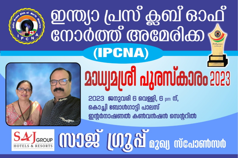 സാജ് എർത്ത് റിസോർട്ട് & കൺവെൻഷൻ സെന്റർ ഇന്ത്യ പ്രസ് ക്ലബ് ഓഫ് നോർത്ത് അമേരിക്കയുടെ അഭിമാനപദ്ധതിയായ മാധ്യമശ്രീ പുരസ്കാരത്തിന്റെ മുഖ്യ സ്പോൺസർ . 2023 ജനുവരി 6 വെള്ളിയാഴ്ച്ച വൈകീട്ട് 6 മണിക്ക് കൊച്ചി ബോൾഗാട്ടി പാലസ് കൺവെൻഷൻ സെന്ററിൽ നടക്കുന്ന വർണാഭമായ ചടങ്ങിലാണ് മാധ്യമശ്രീ,മാധ്യമരത്ന ഉൾപ്പെടെയുള്ള പുരസ്കാരങ്ങൾ വിതരണം ചെയ്യുന്നത്. രാഷ്ട്രീയ-സാമൂഹിക-മാധ്യമ രംഗത്തെ പ്രമുഖർ ചടങ്ങിൽ പങ്കെടുക്കും.