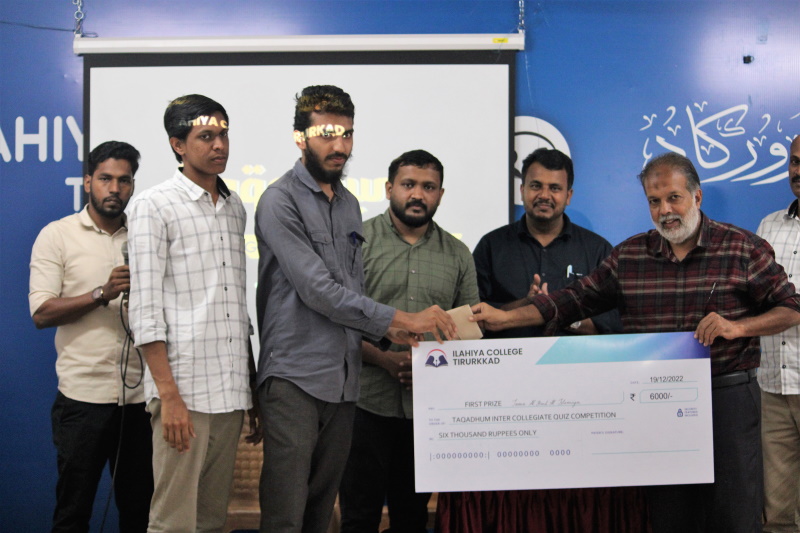 ഫോട്ടോ: തിരൂർക്കാട് ഇലാഹിയ കോളേജിൽ സംഘടിപ്പിച്ച ‘തകദ്ദും’ കോളേജ് തല ക്വിസ് മത്സര വിജയികളായ വേങ്ങര ജാമിഅ അൽ ഹിന്ദ് വിദ്യാർത്ഥികൾക്ക് ട്രസ്റ്റ് വൈസ് ചെയർമാൻ മുഹമ്മദ് അൻവർ സമ്മാനം വിതരണം ചെയ്യുന്നു.