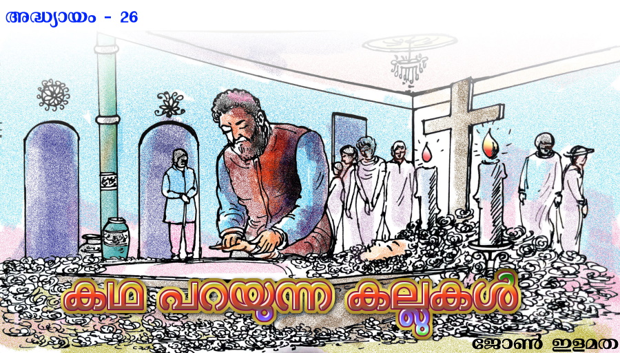 വിറ്റോറിയായുടെ ജഡത്തിനു മുമ്പിലെത്തി. പതിവിലും സുന്ദരിയായിഉറങ്ങിക്കിടക്കുന്നു അവള്. ഇനി ഒരിക്കലും ഉണരാത്തവിധം. ജീവിത സങ്കല്പങ്ങള്ക്കുവേണ്ടി പടവെട്ടി മരിച്ച മറ്റൊരു ക്ലിയോപാട്രാ, ആത്മഹത്യയല്ല എന്നു മാത്രം. സ്വന്തം സങ്കല്പങ്ങള്ക്ക് പോരാടിയ ധീരവനിത! സ്നേഹത്തിന് ദാഹിച്ച്, കൈവരിക്കാനാവാത്ത കാലത്തിനപ്പുറത്തേക്ക് വാടിക്കൊഴിഞ്ഞു പോയ ഒരു പനിനീര് പുവ്! അവളുടെ തലഭാഗത്തിനപ്പുറത്ത് ഏതോ ശില്പി കൊത്തിയ ഒരു ക്രൂശിതരൂപം. അവയ്ക്കിരുപുറവും കത്തി ഉരുകിക്കൊണ്ടിരിക്കുന്ന രണ്ടു വലിയ മെഴുകുതിരികള്. വെള്ളയിലുള്ള മെഴുകുതിരിക്കാലൂകളില്. അതിനപ്പുറത്ത് വിവിധതരം സുഗന്ധ പുഷ്പങ്ങള് ഒരു വലിയ പൊക്കമുള്ള പൂക്കൂടയില് നിറഞ്ഞു നില്ക്കുന്നു.