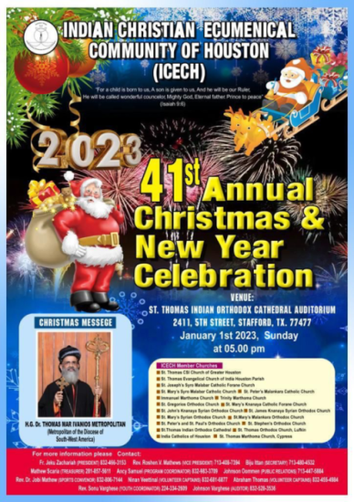 ഹൂസ്റ്റൺ : ഇന്ത്യൻ ക്രിസ്ത്യൻ എക്യൂമെനിക്കൽ കമ്മ്യൂണിറ്റി ഓഫ് ഹൂസ്റ്റണിന്റെ (ഐസിഇസിഎച്ച്) ക്രിസ്തുമസ് പുതുവത്സരാഘോഷം 2023 ജനുവരി 1 നു ഞായറാഴ്ച വൈകിട്ട് 5 മണിക്ക് ഹൂസ്റ്റൺ സെന്റ് തോമസ് ഇന്ത്യൻ ഓർത്തഡോക്സ് കത്തീഡ്രൽ ഓഡിറ്റോറിയത്തിൽ വച്ചു നടത്തപ്പെടും. ഹൂസ്റ്റണിലെ 20 എപ്പിസ്കോപ്പൽ ദേവാലയങ്ങളുടെ കൂട്ടായ്മയായ ഐസിഇസി എച്ചിന്റെ 41-ാമത് ക്രിസ്തുമസ് ആഘോഷമാണ് ഈ വർഷം നടത്തപ്പെടുന്നത്.
