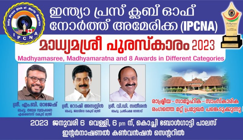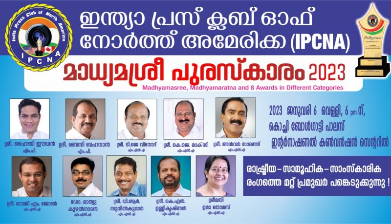 ഇന്ത്യ പ്രസ് ക്ലബ് ഓഫ് നോർത്ത് അമേരിക്കയുടെ മാധ്യമ ശ്രീ, മാധ്യമ രത്ന പുരസ്കാരങ്ങൾ ജനു 6 ന് വൈകീട്ട് 6 മണിക്ക് എറണാകുളം ബോൾഗാട്ടി പാലസ് കൺവൻഷൻ സെന്ററിൽ നടക്കുന്ന ചടങ്ങിൽ വെച്ച് സമ്മാനിക്കും. മന്ത്രിമാരായ എം.ബി രാജേഷ് , റോഷി അഗസ്റ്റിൻ, പ്രതിപക്ഷ നേതാവ് വി.ഡി സതീശൻ എം.പിമാരായ ഹൈബി ഈഡൻ,ബെന്നി ബഹനാൻ, എം.എൽ.എ മാരായ ടി.ജെ വിനോദ്, കെ.ജെ മാക്സി, അൻവർ സാദത്ത്, റോജി എം ജോൺ, ഡോ. മാത്യു കുഴൽനാടൻ, വി.ആർ സുനിൽകുമാർ, കെ.എൻ ഉണ്ണികൃഷ്ണൻ, ഉമാ തോമസ് തുടങ്ങിയവർ പങ്കെടുക്കും.