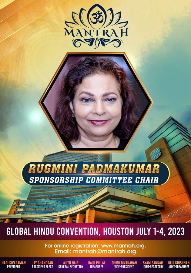 അമേരിക്കൻ മലയാളികളുടെ ഇടയിൽ സുപരിചിത ആയ ഡോ രുഗ്മിണി പത്മകുമാറിനെ മന്ത്ര സ്പോൺസർഷിപ് കമ്മിറ്റി ചെയർ ആയി നിയമിച്ചു . ഐഐടി ബോംബെയിൽ നിന്ന് രസതന്ത്രത്തിൽ ഡോക്ടറേറ്റ് പൂർത്തിയാക്കിയ ശ്രീമതി രുഗ്മിണി അസോസിയേറ്റ് പ്രൊഫസർ ആയി യുഎസിലെ സർവ്വകലാശാലകളായി (നെബ്രാസ്ക യൂണിവേഴ്സിറ്റി- ലിങ്കൺ & മിഷിഗൺ സ്റ്റേറ്റ് യൂണിവേഴ്സിറ്റി) അധ്യാപനത്തിലും ഗവേഷണത്തിലും ജോലി ചെയ്തിരുന്നു