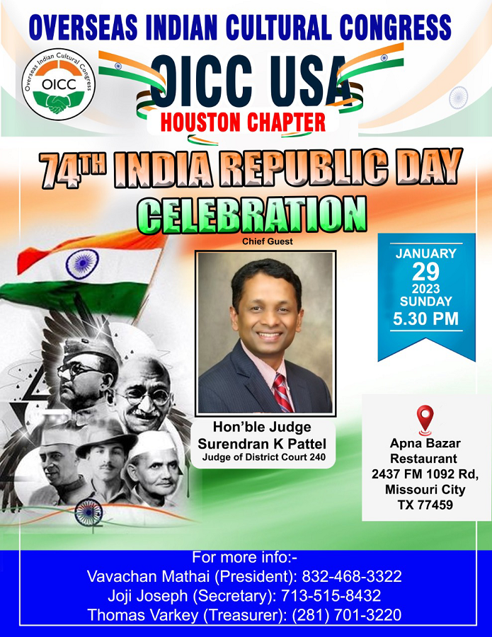 ഹൂസ്റ്റൺ: ഓവർസീസ് ഇന്ത്യൻ കൾച്ചറൽ കോൺഗ്രസ് യുഎസ്എ (ഒഐസിസിയുഎസ്എ) യുടെ ആഭിമുഖ്യത്തിൽ ഇന്ത്യയുടെ എഴുപത്തി നാലാമത് റിപ്പബ്ലിക് ദിനാഘോഷം ജനുവരി 29 നു ഞായറാഴ്ച വൈകുന്നേരം 5:30-ന് നടത്തപ്പെടും.