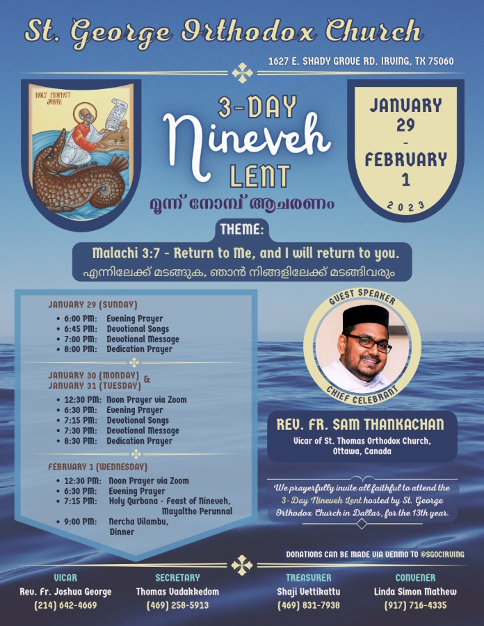 ഡാലസ് : ഇർവിംഗ് സെന്റ്. ജോർജ് മലങ്കര ഓർത്തഡോക്സ് ദേവാലയത്തിൽ ജനുവരി 29 ഞായറാഴ്ച മുതൽ ഫെബ്രുവരി 1 ബുധനാഴ്ച വരെ മൂന്ന് നോമ്പാചരണവും, കൺവെൻഷനും നടത്തപ്പെടുന്നു. കാനഡയിലെ ഒട്ടാവ സെന്റ്. തോമസ് ഓർത്തഡോക്സ് ഇടവക വികാരി റവ.ഫാ. സാം തങ്കച്ചൻ എല്ലാ ദിവസവും മുഖ്യ പ്രഭാഷണം നടത്തും.