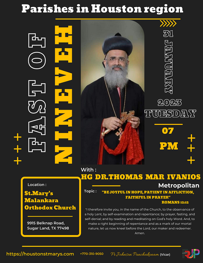 ഹൂസ്റ്റൺ: ഹൂസ്റ്റൺ സെന്റ് മേരീസ് മലങ്കര ഓർത്തഡോക്സ് ദേവാലയത്തിൽ ജനുവരി 29 ഞായറാഴ്ച മുതൽ ഫെബ്രുവരി 1 ബുധനാഴ്ച വരെ മൂന്ന് നോമ്പ് ആചരണത്തിന്റ ഭാഗമായി പ്രത്യക പ്രാർഥനകളും വചന ശുശ്രൂഷയും നടക്കും. ശുശ്രൂഷകൾക്ക് മലങ്കര ഓർത്തോഡോക്സ് സഭയുടെ സൗത്ത് വെസ്റ്റ് അമേരിക്കൻ ഭദ്രാസന മെത്രാപ്പോലീത്ത അഭിവന്ദ്യ ഡോ. തോമസ് മാർ ഇവാനിയോസ് പ്രധാന കാർമികത്വം വഹിക്കും.