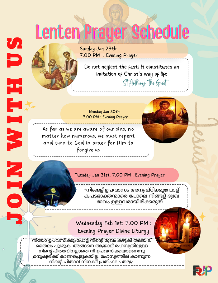 2023 ജനുവരി 29, 30, 31 (ഞായർ, തിങ്കൾ, ചൊവ്വാ) ദിവസങ്ങളിൽ വൈകിട്ട് 7 -നു മൂന്ന് നോമ്പിലെ പ്രത്യേക സന്ധ്യാ നമസ്കാരം നടക്കും.