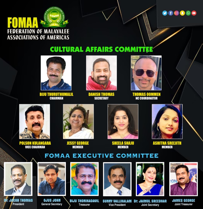 ന്യൂയോർക്ക് : ഫോമയുടെ വരുന്ന രണ്ടു വർഷത്തെ കലാ സാംസ്കാരിക പ്രവർത്തനങ്ങൾ ഏകോപിപ്പിക്കുന്നതിന്റെ ഭാഗമായി വിവിധ റീജിയനുകളിൽ നിന്നുള്ള പ്രതിനിധികളെ ഉൾപ്പെടുത്തിക്കൊണ്ട് കൾച്ചറൽ കമ്മറ്റിയെ പ്രഖ്യാപിച്ചു, ചെയര്മാന് : ബിജു തുരുത്തിമാലില്, സെക്രട്ടറി: ഡാനിഷ് തോമസ്, നാഷണൽ കമ്മറ്റി കോര്ഡിനേറ്റര് : തോമസ് ഉമ്മന്, വൈസ് ചെയര്മാന് : പോള്സണ് കുളങ്ങര, കമ്മിറ്റി അംഗങ്ങള് : ജെസ്സി ജോര്ജ് , ഷീല ഷാജു, അഷിത ശ്രീജിത്ത്,