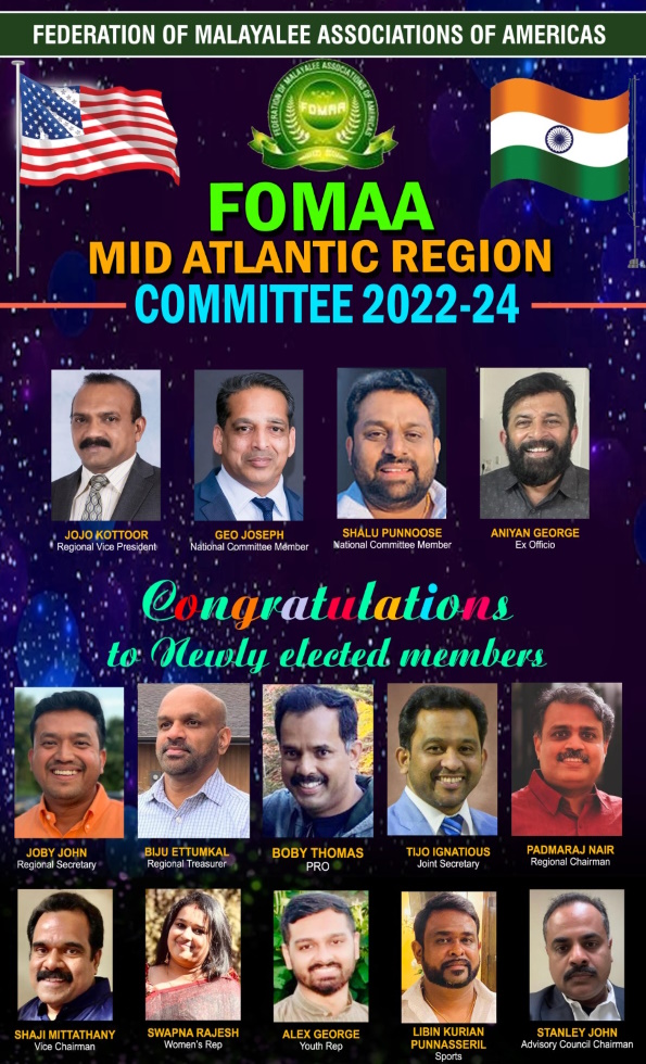 ന്യൂജേഴ്സി : ഫോമയുടെ പ്രമുഖ റീജിയനുകളിലൊന്നായ മിഡ് അറ്റ്ലാന്റിക് റീജിയന്റെ 2022 – 2024 വർഷത്തെ കമ്മിറ്റിയുടെ തിരഞ്ഞെടുപ്പ് ജനുവരി മാസം 26 ആം തീയതി റീജിയണൽ വൈസ് പ്രസിഡന്റ് ശ്രീ ജോജോ കോട്ടൂരിന്റെ നേതൃത്വത്തിൽ നടന്നു,