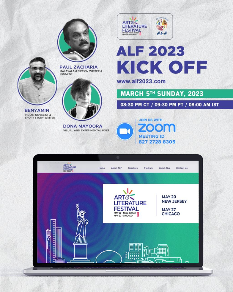 ആർട്സ് & ലിറ്ററേച്ചർ ഫെസ്റ്റിവലിന് നാന്ദി കുറയ്ക്കുന്നതിന്ൻറെ ഭാഗമായി 2023 മാർച്ച് 5 ഞായറാഴ്ച (8.30 PM (CST ), 9.30 PM (EST ), 8.00 AM (IST )) ALF 2023 അതിഥികളുമായി സൂം മീറ്റിംഗ് സജ്ജമാക്കിയിട്ടുണ്ട്. സൂം മീറ്റിംഗ് ഐഡി:8272728 8305.