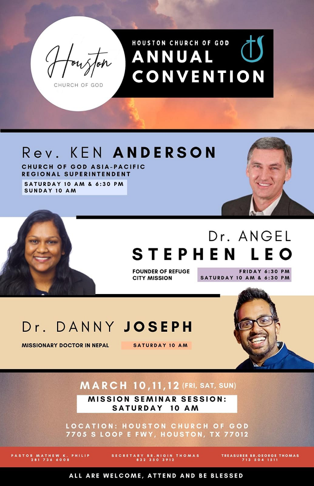 ഹൂസ്റ്റൺ ചർച്ച് ഓഫ് ഗോഡ് ദേവാലയത്തിൽ (7705, S Loop E FWY, Houston, TX 77012) നടത്തപെടുന്ന യോഗങ്ങളിൽ പ്രമുഖ കൺവെൻഷൻ പ്രസംഗകർ ദൈവവചന ശുശ്രൂഷയ്ക്ക് നേതൃത്വം നൽകും.