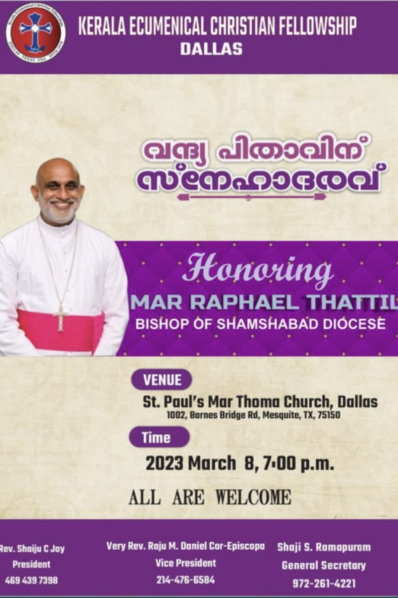 ഡാളസ് :ബിഷപ്പ് മാർ റാഫേൽ തട്ടിലിനു ഡാളസ് സെന്റ് പോൾസ് മാർത്തോമ ചർച്ചിൽ മാർച്ച് 8നു വൈകീട്ട് 7 മണിക് കേരള എക്ക്യൂമിനികൽ ക്രിസ്ത്യൻ ഫെൽലോഷിപ്പിന്റെ ആഭിമുഖ്യത്തിൽ സ്വീകരണം നല്കുന്നു. കെ സി ഇ എഫ് പ്രസിഡന്റ് റവ ഷൈജു സി ജോയ് അച്ചന്റെ അധ്യക്ഷതയിൽ ചേരുന്ന സമ്മേളനത്തിൽ ഡാളസ്സിലെ ഇതര സഭ വിഭാഗങ്ങളിൽ നിന്നുള്ള വൈദീകരും , സാമൂഹ്യ സാംസ്കാരിക നേതാക്കളും വിശ്വാസ സമൂഹവും പങ്കെടുക്കുമെന്ന് സെക്രട്ടറി ഷാജി എസ് രാമപുരം അറിയിച്ചു.