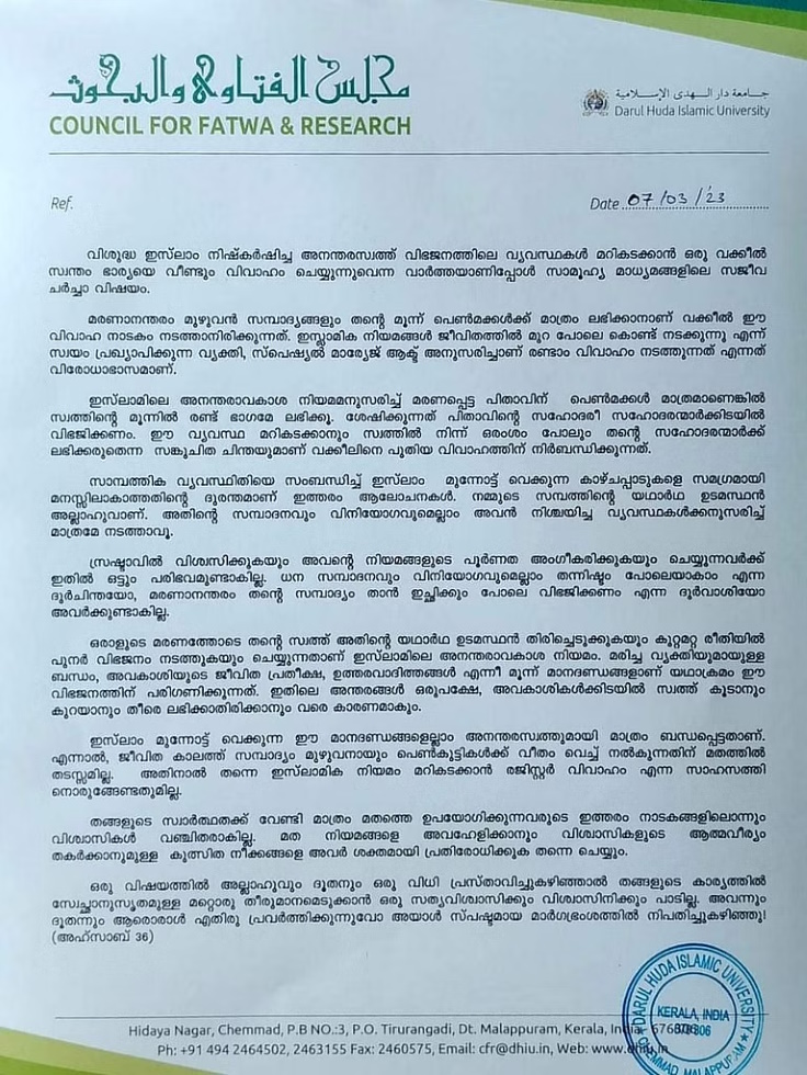 സ്പെഷ്യൽ മാര്യേജ് ആക്ട് പ്രകാരം ഭാര്യയെ പുനർവിവാഹം ചെയ്ത ഷുക്കൂർ വക്കീലിനെതിരെ ഫത്വ കൗൺസിൽ പ്രസ്താവനയിറക്കി. ഷുക്കൂർ വക്കീലിന്റെ വിവാഹ രജിസ്ട്രേഷൻ ഒരു തന്ത്രമാണെന്ന് ആരോപിച്ച് സമസ്തയുടെ കീഴിലുള്ള ദാറുൽ ഹുദാ യൂണിവേഴ്സിറ്റി ഫത്വ കൗൺസിൽ പ്രസ്താവനയിറക്കി. തന്റെ മരണശേഷം തന്റെ സമ്പാദ്യം മുഴുവൻ തന്റെ മൂന്ന് പെൺമക്കൾക്ക് നൽകാനാണ് അഭിഭാഷകന്റെ നാടകമെന്ന് ഫത്വ കൗൺസിൽ ആരോപിച്ചു.