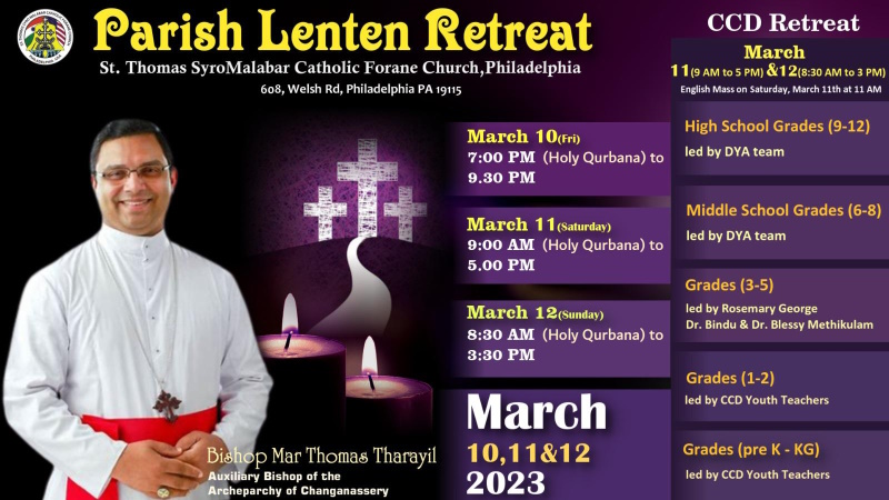 ഫിലാഡല്ഫിയ: സെന്റ് തോമസ് സീറോ മലബാര് ഫൊറോനാപള്ളിയിലെ വാര്ഷികധ്യാനം മാര്ച്ച് 10 വെള്ളിയാഴ്ച്ച വൈകുന്നേരം ഏഴുമണിക്ക് ആരംഭിച്ച് ഞായറാഴ്ച്ച മൂന്നുമണിക്ക് അവസാനിക്കും. ചങ്ങനാശ്ശേരി അതിരൂപതാസഹായമെത്രാന് മാര് തോമസ് തറയില് ആണ് ധ്യാനം നയിക്കുന്നത്. മുതിര്ന്നവര്ക്കും, യുവാക്കള്ക്കും, മതബോധനസ്കൂള് കുട്ടികള്ക്കും സമാന്തരമായി വ്യത്യസ്ത ട്രാക്കുകളിലായിട്ടാണു ധ്യാനം ക്രമീകരിച്ചിരിക്കുന്നത്.