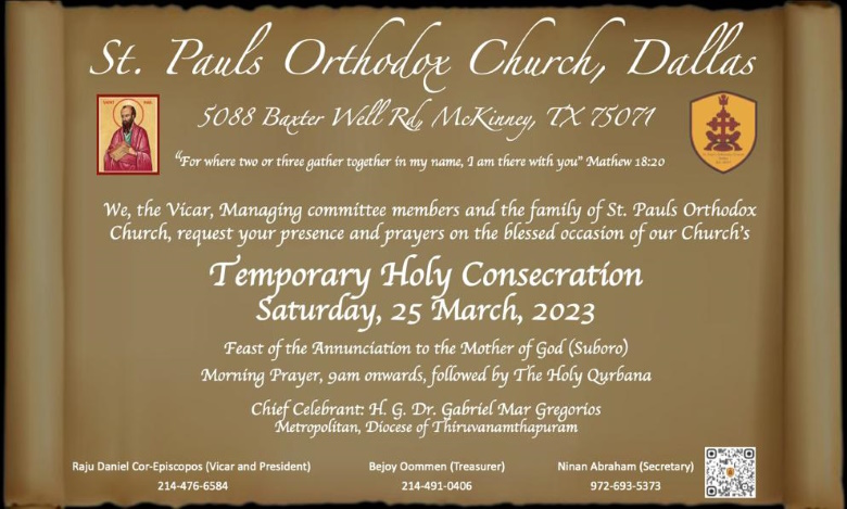 മക് ക്കിനിയിൽ പുതിയതായി വാങ്ങിയ സെന്റ്. പോൾസ് മലങ്കര ഓർത്തഡോക്സ് ഇടവകയുടെ പ്രവേശന ചടങ്ങിലേക്ക് ഏവരേയും സ്വാഗതം ചെയ്യുന്നതായി ഇടവക ചുമതലക്കാർ അറിയിച്ചു.