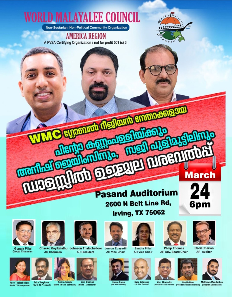 വേൾഡ് മലയാളി കൗൺസിൽ ഗ്ലോബൽ സെക്രട്ടറി ശ്രീ പിന്റോ കണ്ണംപള്ളിയ്ക്കും അമേരിയ്ക്ക റീജിയൻ സെക്രട്ടറി ശ്രീ അനീഷ് ജെയിംസിനും ട്രഷറർ ശ്രീ സജി പുളിമൂട്ടിലിനും നോർത്ത് ടെക്സാസ് പ്രൊവിൻസിന്റെയും ഡാളസ് പ്രൊവിൻസിന്റെയും സംയുക്തമായ ആഭിമുഖ്യത്തിൽ മാർച്ച് 24 ആം തീയതി വൈകുന്നേരം 6 മണിയ്ക്ക് ഡാളസിലെ പസന്റ് ഓഡിറ്റോറിയത്തിൽ വച്ച് ഉജ്വല സ്വീകരണം സംഘടിപ്പിയ്ക്കുവാൻ തീരുമാനിച്ചതായി പ്രൊവിൻസ് ഭാരവാഹികളായ നോർത്ത് ടെക്സാസ് പ്രൊവിൻസ് ചെയർ പേഴ്സൺ ശ്രീമതി ആൻസി തലച്ചെല്ലൂർ, നോർത്ത് ടെക്സാസ് പ്രൊവിൻസ് പ്രസിഡന്റ് ശ്രീ സുകു വര്ഗീസ്, ഡാളസ് പ്രൊവിൻസ് പ്രസിഡന്റ് ശ്രീ അലക്സ് അലക്സാണ്ടർ, ഹൂസ്റ്റൺ പ്രസിഡന്റ് ശ്രീ റോയ് മാത്യു എന്നിവർ അറിയിച്ചു്.