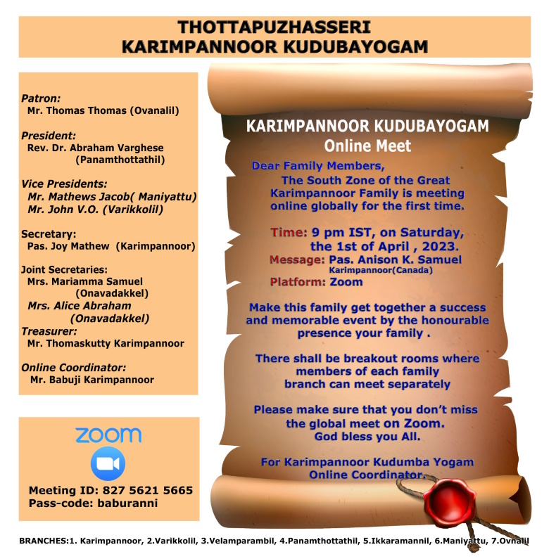 ഹൂസ്റ്റൺ: കരിമ്പന്നൂർ മഹാകുടുംബത്തിൻറെ തെക്കൻ സോണായ തോട്ടപ്പുഴശ്ശേരി- കരിമ്പന്നൂർ കുടുംബത്തിലെ 7 ശാഖകളുടെ ഒരു ഓൺലൈൻ സമ്മേളനം 2023 ഏപ്രിൽ 1 ശനിയാഴ്ച്ച ഇന്ത്യൻ സമയം വൈകിട്ട് 9 മണിക്ക് സൂം പ്ലാറ്റ് ഫോമിൽ നടത്തപ്പെടും.