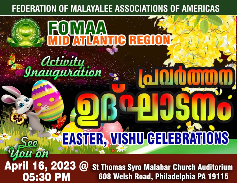 പെൻസിൽവാനിയ : ഫോമായുടെ പ്രധാന റീജിയനകളിൽ ഒന്നായ മിഡ് അറ്റ്ലാന്റിക് റീജിയന്റെ 2023-2024 വർഷത്തെ പ്രവർത്തന ഉത്ഘാടനം വിപുലമായ പരിപാടികളോട് കൂടി ആഘോഷിക്കാൻ തീരുമാനിച്ചതായി റീജിണൽ വൈസ് പ്രസിഡന്റ് ജോജോ കോട്ടൂർ അറിയിച്ചു . ഫിലാഡൽഫിയയിലെ സെയിന്റ് തോമസ് സിറോ മലബാർ ചുര്ച്ച് ഓഡിറ്റോറിയത്തിൽ വച്ച് ഏപ്രിൽ 16 ഞായറാഴ്ച്ച വൈകുന്നേരം 5.30 നു അരങ്ങേറുന്ന പരിപാടിയിൽ ഫോമാ വൈസ് പ്രസിഡന്റ് സണ്ണി വള്ളിക്കളം മുഖ്യാതിഥി ആയിരിക്കും ന്യൂജേഴ്സി ,പെൻസിൽവാനിയ ,ഡെലവെയെർ സംസ്ഥാനങ്ങളിൽ നിന്നുള്ള സംഘടനകളിലെ അംഗങ്ങളുടെ സജീവ സാന്നിധ്യം പ്രതീക്ഷിക്കുന്നതായി റീജിയണൽ സെക്രട്ടറി ജോബി ജോൺ അറിയിച്ചു