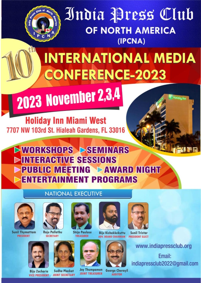ഹ്യൂസ്റ്റൺ: ഈ വർഷം നവംബർ 2, 3, 4 തീയതികളിൽ മയാമിയിൽ നടക്കുന്ന ഇന്ത്യാ പ്രസ് ക്ലബ് ഓഫ് നോർത്ത് അമേരിക്കയുടെ ഇന്റർനാഷണൽ മീഡിയ കോൺഫ്രൻസിന്റെ ആദ്യ കിക്ക് ഓഫ് ഹ്യൂസ്റ്റനിൽ നടക്കും. ഏപ്രിൽ 17 ന് തിങ്കളാഴ്ച വൈകുന്നേരം ഏഴുമണിക്ക് മിസ്സോറി സിറ്റിയിൽ വച്ചാണ് കിക്ക് ഓഫ് നടക്കുക എന്ന് ഐ പി സി എൻ എ ഹ്യൂസ്റ്റൺ ചാപ്റ്റർ പ്രസിഡന്റ് ജോർജ് തെക്കേമല അറിയിച്ചു.