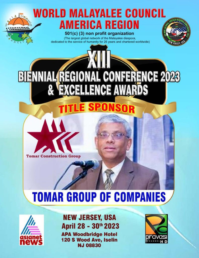 ഫിലാഡൽഫിയ: അമേരിക്ക റീജിയൻ വേൾഡ് മലയാളി കൗൺസിൽ പതിമൂന്നാമത് ബൈനിൽ കോൺഫറൻസിന് 2023 ഏപ്രിൽ 28 വെള്ളിയാഴ്ച വൈകിട്ട് 6 മണിക്ക് ന്യൂജേഴ്സിയിലുള്ള എപിഎ ഹോട്ടലിൽ തിരശ്ശീല ഉയരും. ഞായറാഴ്ച ഉച്ചയ്ക്ക് 11 മണിക്ക് അവസാനിക്കുന്ന കോൺഫറൻസിന്റെ മെഗാ സ്പോൺസർ ആയി തോമാർ ഗ്രൂപ്പ് ഉടമ ശ്രീ തോമസ് മുട്ടയ്ക്കൽ.