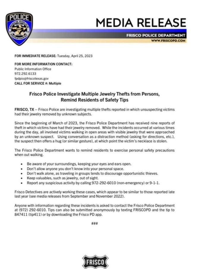ഫ്രിസ്കോ (ഡാളസ്):ഡാളസ് കൗണ്ടിയിലെ ഫ്രിസ്കോ സിറ്റിയിൽ വർദ്ധിചു വരുന്ന ആഭരണ കവർച്ചക്കെതിരെ പോലീസിൻറെ മുന്നറിയിപ്പ് .ഫ്രിസ്കോ സിറ്റിയിൽ 2023 മാർച്ച് മുതൽ ഇന്നുവരെ 9 ആഭരണ കവർച്ച കേസുകൾ റിപ്പോർട്ട് ചെയ്യപ്പെട്ടതായി പൊലീസ് ഏപ്രിൽ 25 നു പുറത്തു വിട്ട റിപ്പോർട്ടിൽ പറയുന്നു.