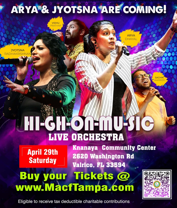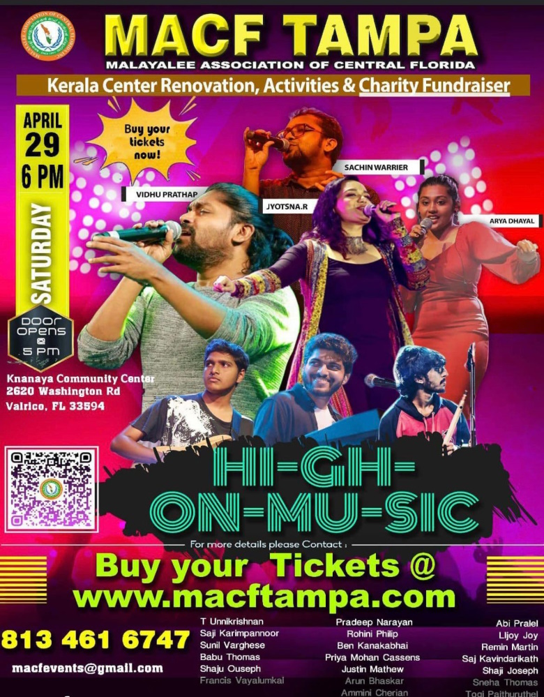ഹൂസ്റ്റണിലും , ഡെൻവറിലുമൊക്കെ ജനഹൃദയങ്ങളിൽ മറക്കാനാവാത്ത പ്രകടനം നടത്തിയ ശേഷമാണു ഈ ടീം ഫ്ളോറിഡയിലെത്തുന്നത്. ടിക്കറ്റുകൾ അസോസിയേഷന്റെ വെബ്സൈറ്റിൽ നിന്നും വാങ്ങാവുന്നതാണ് www.macftampa.com . ഓൺലൈൻ വഴി മാത്രമാണ് ടിക്കറ്റുകൾ വിറ്റഴിച്ചത്.