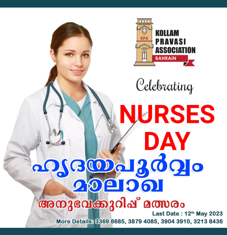 ബഹ്റൈന്: കൊല്ലം പ്രവാസി അസ്സോസിയേഷനും, കെ.പി.എ ഹോസ്പിറ്റൽ ചാരിറ്റി വിങ്ങും സംയുക്തമായി അന്താരാഷ്ട്ര നഴ്സസ് ഡേയോട് അനുബന്ധിച്ച് ബഹ്റൈനിലെ നഴ്സുമാർക്കായി ഹൃദയപൂര്വ്വം മാലാഖ എന്ന പേരിൽ അനുഭവക്കുറിപ്പ് മത്സരം നടത്തുന്നു. നഴ്സിംഗ് ജീവിതത്തിൽ മറക്കാനാകാത്ത അനുഭവങ്ങളോ, സംഭവങ്ങളോ എല്ലാ നഴ്സുമാർക്കും തീർച്ചയായും ഉണ്ടായിരിക്കും. ഹൃദയസ്പര്ശിയായ ആ അനുഭവം മലയാളത്തിൽ സ്വന്തം കൈപ്പടയിൽ രണ്ടു A4 പേജിൽ കവിയാതെ എഴുതി അയക്കുക. ഏറ്റവും മികച്ച ഹൃദയസ്പര്ശിയായ എഴുത്തുകള്ക്കു കെ.പി.എ ഉപഹാരം നൽകി ആദരിക്കുന്നു. അവസാന തീയതി 12 മെയ് 2023.