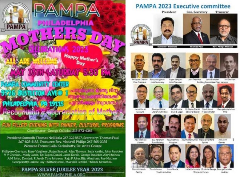 ഫിലാഡൽഫിയ: പെൻസിൽവാനിയ അസോസിയേഷൻ ഓഫ് മലയാളി പോസ്പിരിറ്റി ആൻഡ് അഡ്വാൻസ്മെൻറ്റ് (പമ്പ) യുടെ മാതൃ ദിനാഘോഷങ്ങൾ മെയ് 13 ശനിയാഴ്ച വൈകിട്ട് 5:30 നു പമ്പ കമ്മ്യൂണിറ്റി ഹാളിൽ വച്ച് അതിവിപുലമായ പരിപാടികളോടെ നടത്തപ്പെടും.