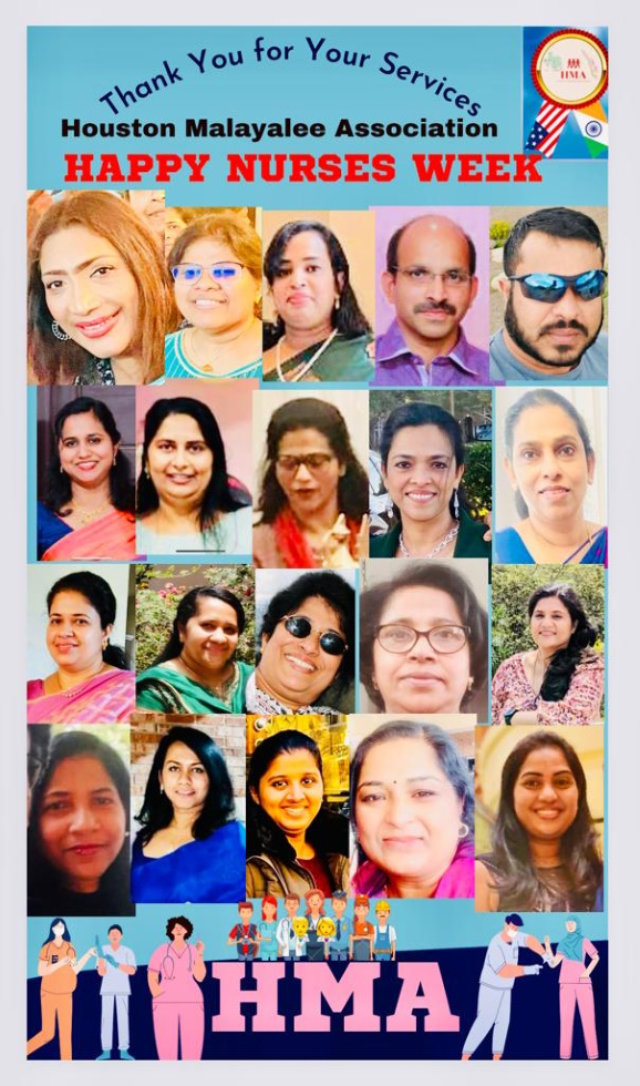 ഹൂസ്റ്റൺ: ഹൂസ്റ്റൺ മലയാളി അസോസിയേഷൻ (എച്ച്എംഎ) നഴ്സസ് ദിനം ആചരിക്കുന്നു. നഴ്സുമാരുടെ നിസ്വാർത്ഥതക്കും അർപ്പണബോധത്തിനുമുള്ള ആദരവായാണ് ആഘോഷം. ലോകമെമ്പാടുമുള്ള നഴ്സുമാരുട പ്രവർത്തനങ്ങളോടുള്ള അഭിനന്ദനവും അവരുടെ സേവനങ്ങൾക്ക് നന്ദിയും പ്രകടിപ്പിക്കാനുള്ള അവസരമാണ് ഓരോ നഴ്സസ് ദിനവും.