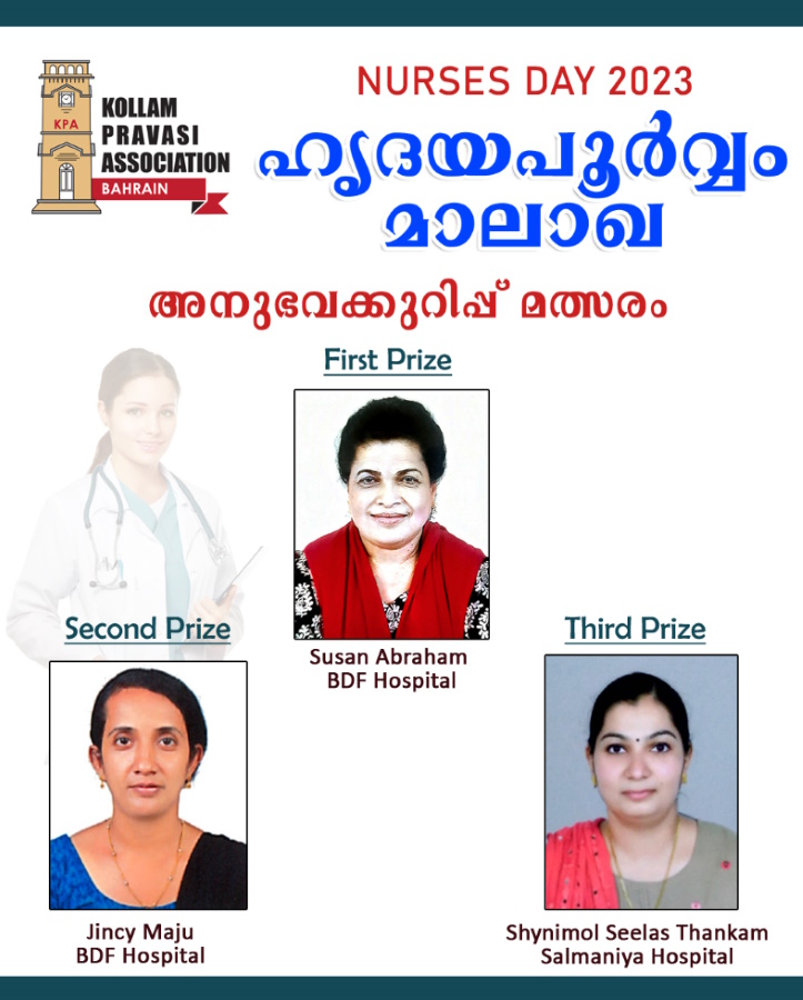 കൊല്ലം പ്രവാസി അസ്സോസിയേഷനും, കെ.പി.എ ഹോസ്പിറ്റൽ ചാരിറ്റി വിങ്ങും സംയുക്തമായി അന്താരാഷ്ട്ര നഴ്സസ് ഡേയോട് അനുബന്ധിച്ച് ബഹ്റൈനിലെ നഴ്സുമാർക്കായി ഹൃദയപൂര്വ്വം മാലാഖ എന്ന പേരിൽ സംഘടിപ്പിച്ച അനുഭവക്കുറിപ്പ് മത്സരവിജയികളെ പ്രഖ്യാപിച്ചു. ഒന്നാം സമ്മാനം സൂസൻ എബ്രഹാം (ബി.ഡി.എഫ് ഹോസ്പിറ്റൽ), രണ്ടാം സമ്മാനം ജിൻസി മജു (ബി.ഡി.എഫ് ഹോസ്പിറ്റൽ). മൂന്നാം സമ്മാനം ഷൈനിമോൾ സീലസ് തങ്കം എന്നിവർ കരസ്ഥമാക്കി.