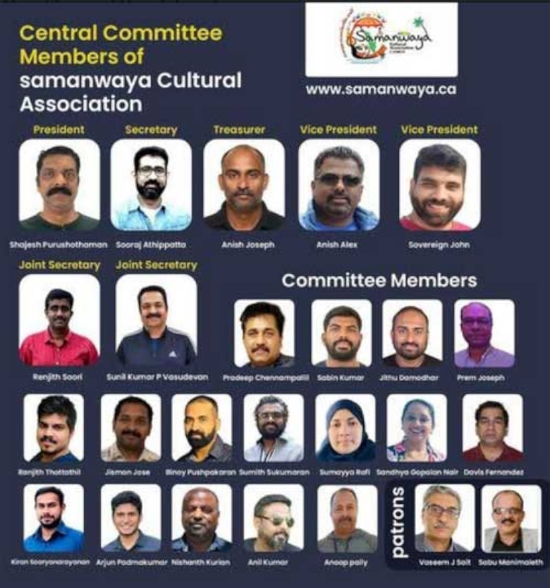 സമന്വയ കാനഡയുടെ 2023 – 2025 ഭാരവാഹികളായി ഷാജേഷ് പുരുഷോത്തമൻ (പ്രസിഡന്റ് ), അനീഷ് അലക്സ്, സോവറിൻ ജോൺ (വൈസ് പ്രസിഡന്റുമാർ ), സൂരജ് അത്തിപ്പറ്റ ( സെക്രട്ടറി), രഞ്ജിത് സൂരി, സുനിൽ കുമാർ ( ജോയിന്റ് സെക്രട്ടറിമാർ), അനീഷ് ജോസഫ് ( ട്രഷറർ), പ്രദീപ് ചേന്നം പള്ളിൽ, ബിനോയി പാലപ്പറമ്പിൽ , അനൂപ് പൈലി, നിഷാന്ത് കുര്യൻ , രഞ്ജിത് തോട്ടത്തിൽ , സബിൻ കുമാർ , പ്രേം ജോസഫ് , സന്ധ്യ ഗോപാലൻ നായർ , ജിസ്മോൻ ജോസ് , അനിൽ കുമാർ ചാലക്കുടി, അർജുൻ പദ്മകുമാർ , സുമിത് സുകുമാരൻ, ജിത്തു ദാമോദർ , സുമയ്യ റാഫി , ഡേവിസ് ഫെർണാണ്ടസ് , കിരൺ സൂര്യനാരായണൻ ( കമ്മറ്റിയംഗങ്ങൾ) എന്നിവരേയും, സാബു മണിമലേത്ത്, വസീം J സേട്ട് എന്നിവരെ രക്ഷാധികാരികളായും തിരഞ്ഞെടുത്തു.