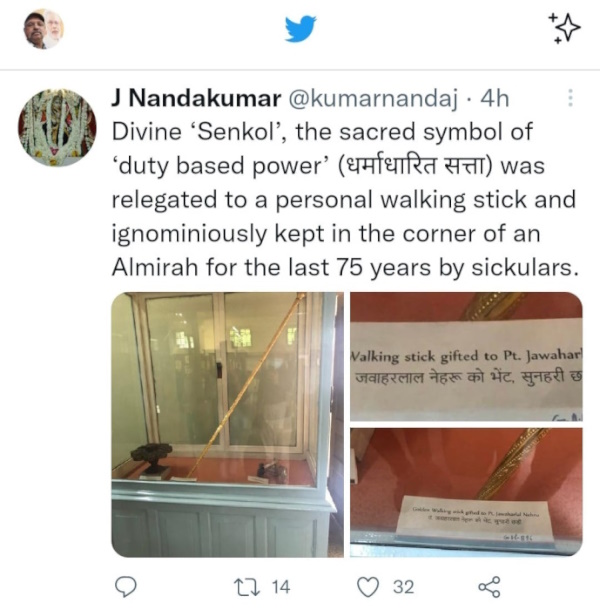 ചിത്രം 1,2 അലഹബാദ് ആനന്ദഭവൻ മ്യൂസിയത്തിൽ സൂക്ഷിച്ചിരുന്ന ചെങ്കോലിൻ്റെ ചിത്രം.