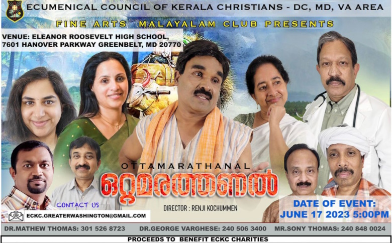 മേരിലാൻഡ് : വാഷിങ്ടൺ DC, മേരിലാൻഡ്, വിർജീനിയ ഏരിയയിലെ എക്യുമിനിക്കൽ കൗൺസിൽ ഓഫ് കേരള ക്രിസ്ത്യൻസിന്റെ ആഘോഷപരിപാടികളുടെ ഭാഗമായി ന്യുജേഴ്സി ഫൈൻ ആർട്സ് മലയാളത്തിന്റെ സംഗീത നാടകം “ഒറ്റമരത്തണൽ ” ജൂൺ 17 ശനിയാഴ്ച്ച വൈകുന്നേരം 5 മണിക്ക് അരങ്ങേറും. എലനോർ റൂസ്വെൽറ്റ് ഹൈസ്കൂൾ ഓഡിറ്റോറിയത്തിൽ വച്ചാണ് (7601 Hanover Parkway, Greenbelt, MD 20770) നാടകാവതരണം.