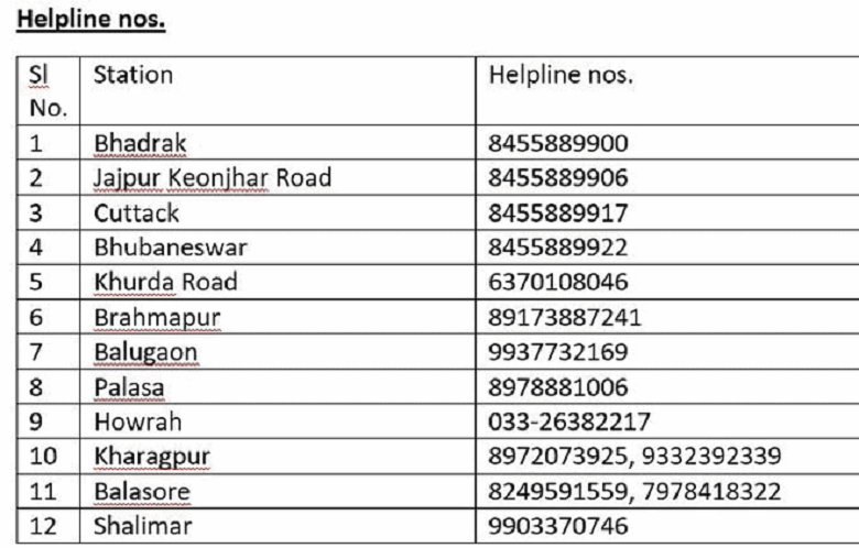 ഒഡീഷ സർക്കാർ ഹെൽപ്പ് ലൈൻ 06782-262286 പുറപ്പെടുവിച്ചിട്ടുണ്ട്. 033-26382217 (ഹൗറ), 8972073925 (ഖരഗ്പൂർ), 8249591559 (ബാലസോർ), 044- 25330952 (ചെന്നൈ) എന്നിവയാണ് റെയിൽവേ ഹെൽപ്പ് ലൈനുകൾ.