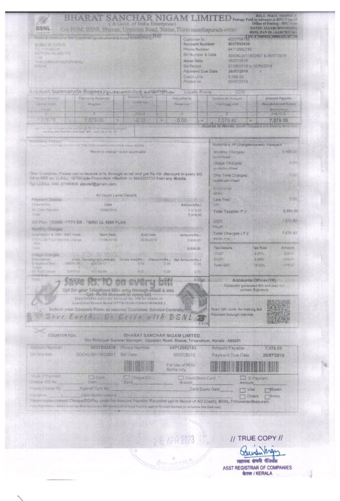 കമ്പനി രജിസ്റ്റർ ചെയ്യാനായി,അഡ്രസ്സ് പ്രൂഫായി ടി കമ്പനി ഉടമകൾ റസിസ്റ്റ്രാർ ഓഫ് കമ്പനീസിന്റെ ഓഫീസിൽ സമർപ്പിച്ചിരുക്കുന്നത് ഈ ബി.എസ്.എൻ.എൽ ഫോൺ ബില്ലാണ്.