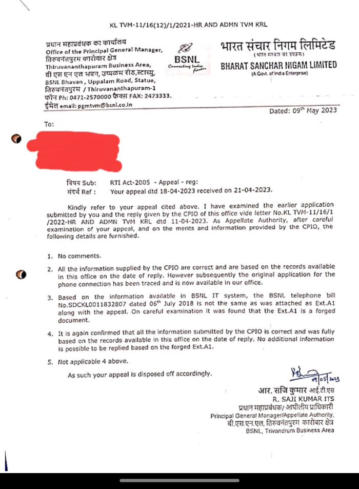 ഈ ബില്ലിന്റെ കോപ്പി വച്ച് ഒരു സുഹൃത്ത്,വിവരാവകാശ നിയമപ്രകാരം ഈ ബില്ലിന്റെ ആധികാരികത സംബന്ധിച്ച് BSNL പ്രിൻസിപ്പൽ ജനറൽ മാനേജർക്ക്(തിരുവനന്തപുരം) ഒരു RTI അപേക്ഷ നൽകിയിരുന്നു.ആദ്യത്തെ ചിത്രത്തിലുള്ള ബില്ലിന്റെ അറ്റസ്റ്റഡ് കോപ്പിയും ഒപ്പം ചേർത്തിരുന്നു.അതിന്റെ ആധികാരികത സംബന്ധിച്ചും അപേക്ഷയിൽ ചോദ്യം ചോദിച്ചിരുന്നു.